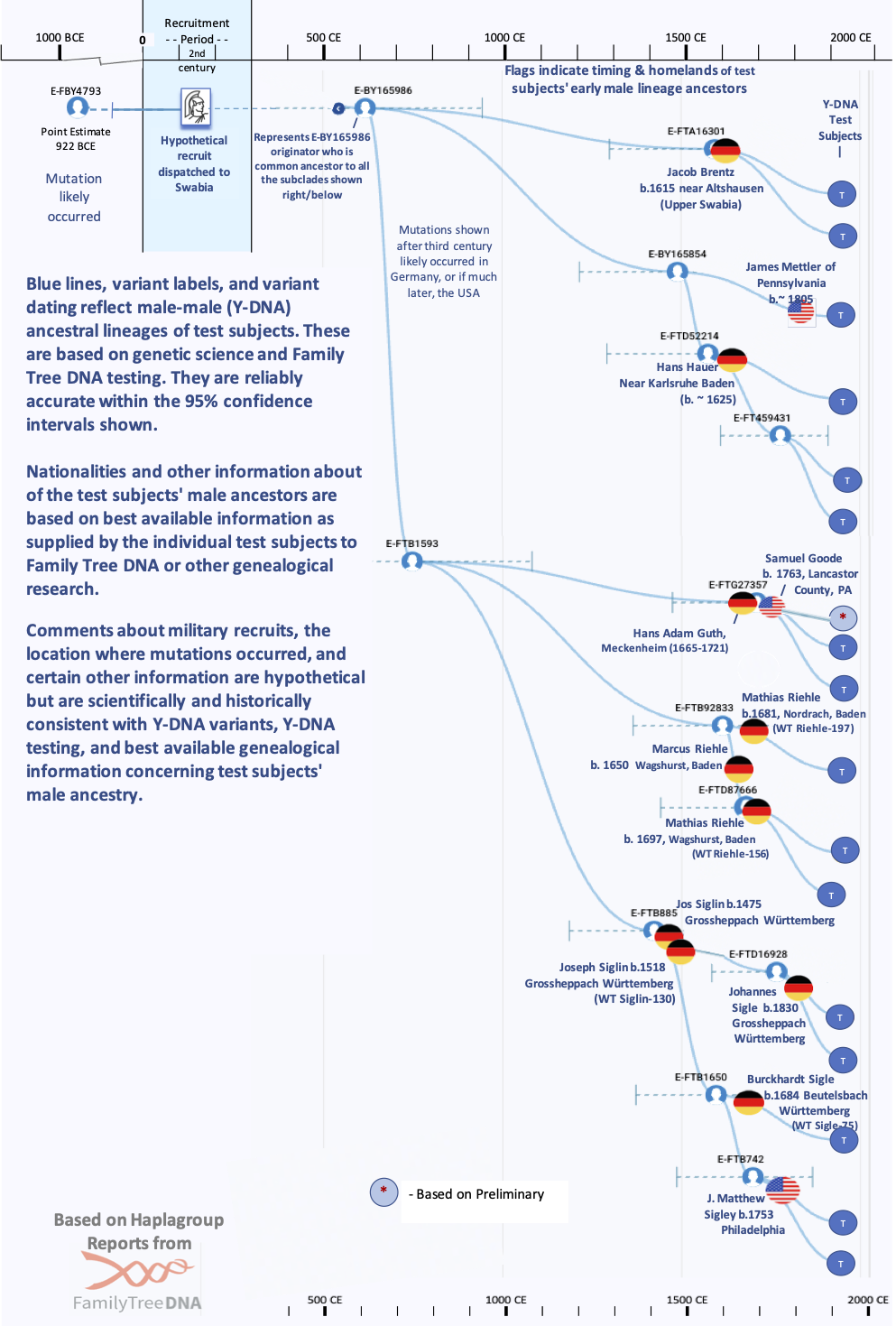 Moreover, while all of our testers’ identified ancestors in or near Swabia have carried the E-BY165986 variants, this does not preclude the possibility that other lineages, with as yet unidentified mutations, might have branched off from our E-BY4793 lineage after our migrant arrived in the region but before the defining BY165986 mutation occurred. Such a branch would have most of the variants identified with E-BY165986 but would have one or more additional variants not found in E-BY165986 and its subclades. While we have not encountered evidence of this, with perhaps several hundred years between the arrival of our E-BY4793 ancestor in Swabia and the E-BY165986 mutation, such other lineages and subsequent mutations would have to be considered likely. If so, we anticipate ongoing Y-DNA testing will show this to be the case.